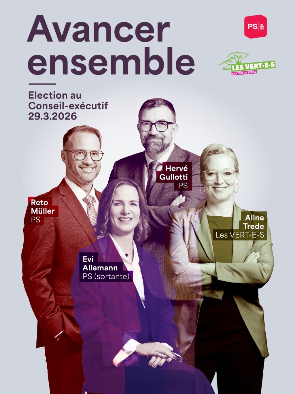 Les VERT-E-S et le PS se présentent aux élections au Conseil-exécutif de 2026 avec quatre candidat-e-s compétent-e-s et motivé-e-s. Ensemble, nous voulons oeuvrer à faire avancer notre canton. Pour que le canton soit prêt à aborder l’avenir, il faut rapidement prendre des mesures efficaces en faveur de la protection du climat et de la transition énergétique. Nous militons pour une société solidaire dans laquelle chacun peut compter sur un système de santé accessible à toutes et tous, où les primes d’assurance maladie ne constituent pas un risque de pauvreté et où la violence genrée est combattue de manière systématique. Nous nous engageons pour un canton qui vit et encourage sa diversité culturelle et linguistique dans la société, la politique, l’éducation, l’administration et l’économie.